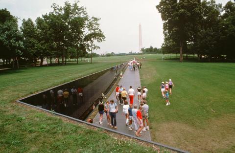 View of the Vietnam Veterans Memorial looking west toward the Washington Monument. The competition-winning design by Maya Lin was dedicated in 1982. The starkly modern memorial, with its wall of inscribed names of the fallen, introduced a new landscape-oriented typology into the design of memorials and a new theme of explicit commemoration of wars on the National Mall.